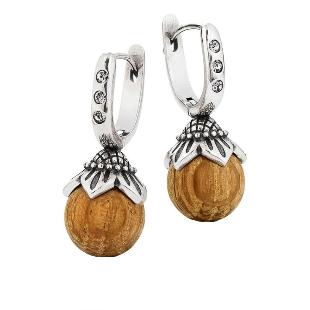 A tölgyfából készült gyöngyöt ezüst virág díszíti. Elegáns, függő kialakítású fülbevaló jó ízlésű hölgyeknek. A Waidzeit Barrique fülbevaló ideális ajándék a bor kedvelőinek.